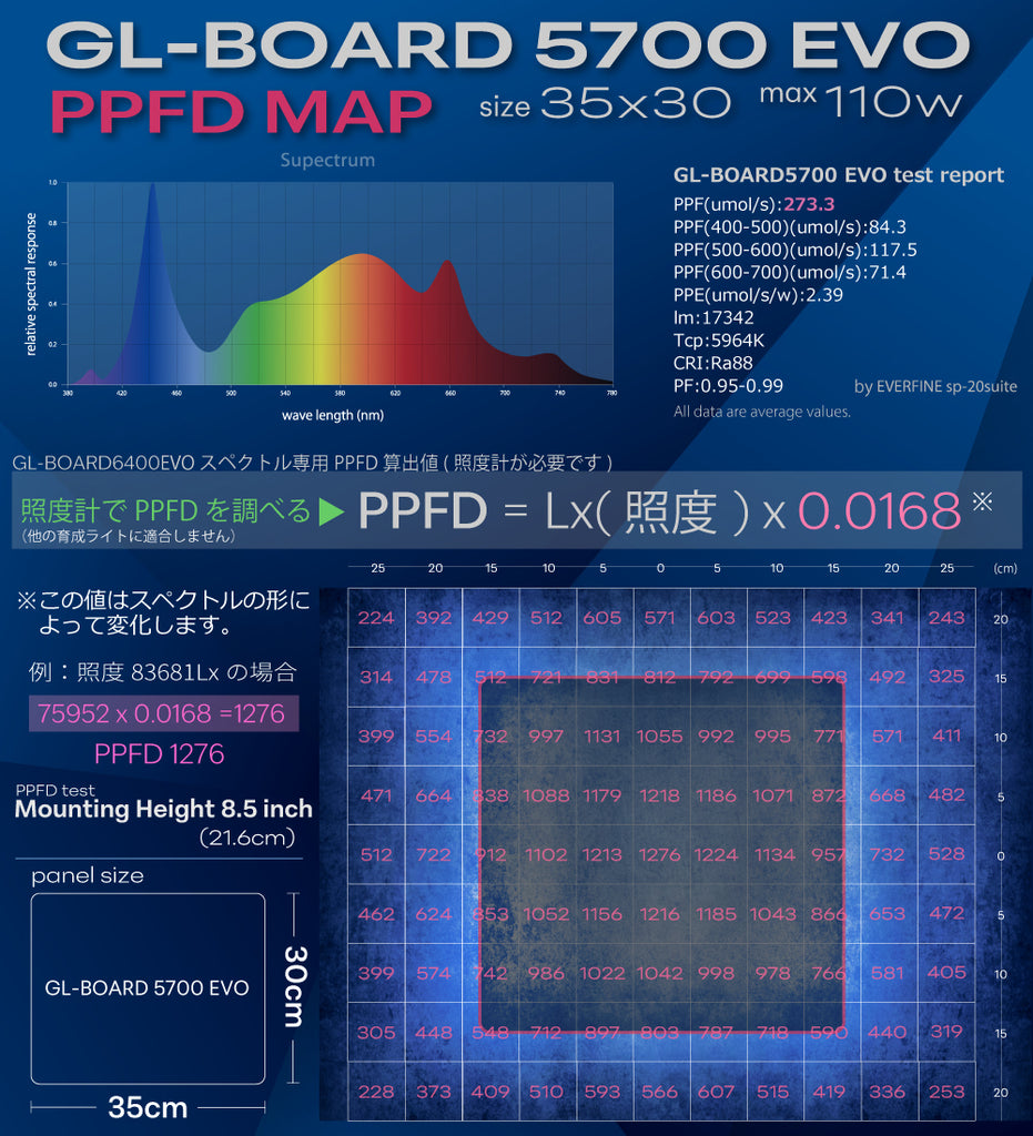 GL-BOARD5400EVO後継機。LEDにSAMSUNG  植物育成向けLM301Hを搭載。無段階調光機能付き110Wモデル。防水性能IP65(防水処理済み専用LEDドライバ・LED側を高撥水防水樹脂コーティング)   仕様変更内容【無段階調光機能搭載で光の強弱が細かく設定出来ます。パネルサイズは29.4x27から35x30へ拡大。出力向上のためヒートシンクの厚みを0.5ミリ厚くしてLEDヘの負荷も軽減されます。】製品3年保証。
